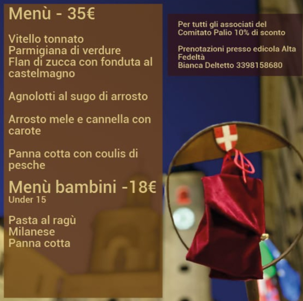 Per partecipare alla cena è necessario prenotare. Le prenotazioni si raccolgono presso l'edicola Alta Fedeltà. Per ulteriori informazioni è possibile contattare Bianca Deltetto al numero 339/8158680. È inoltre previsto uno sconto del 10% per tutti gli associati del Comitato Palio.