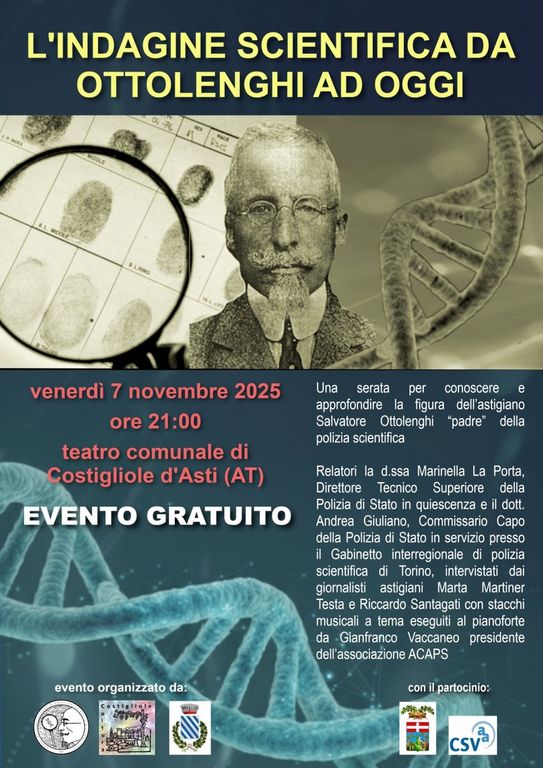 A Costigliole d’Asti, organizzato insieme all’associazione Costigliole Cultura e all’associazione culturale Amici della Polizia Scientifica ODV, si terrà l’evento “L’indagine scientifica da Ottolenghi ad oggi”, dedicato alla storia della criminalistica forense in Italia.