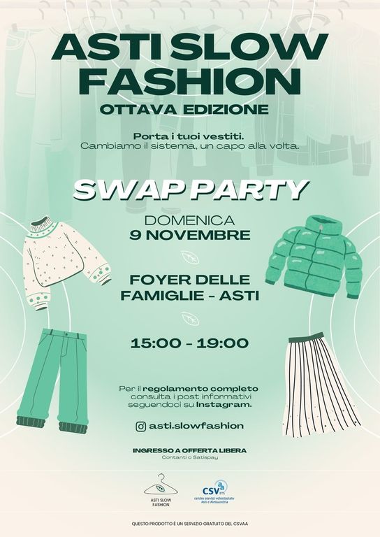 Domenica 9 novembre, dalle 15 alle 19, il Foyer delle Famiglie accoglierà l’Asti slow fashion, l’ottava edizione dell’evento di scambio di vestiti.
