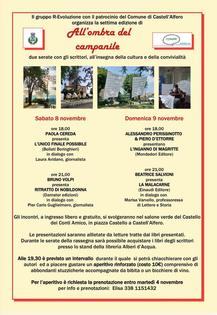 Sabato 8 e domenica 9 novembre, torna a Castell’Alfero “All’ombra del campanile”, un appuntamento fisso del panorama culturale astigiano, organizzato con il patrocinio del Comune.