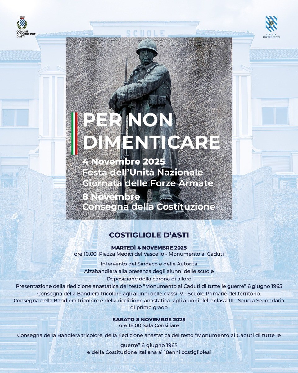 Il 4 novembre Giornata dell'Unità Nazionale e delle Forze Armate viene celebrata quest’anno a Costigliole con iniziative che affiancano alla cerimonia istituzionale alcuni momenti significativi e coinvolgenti dedicati alla cittadinanza e agli alunni delle scuole.