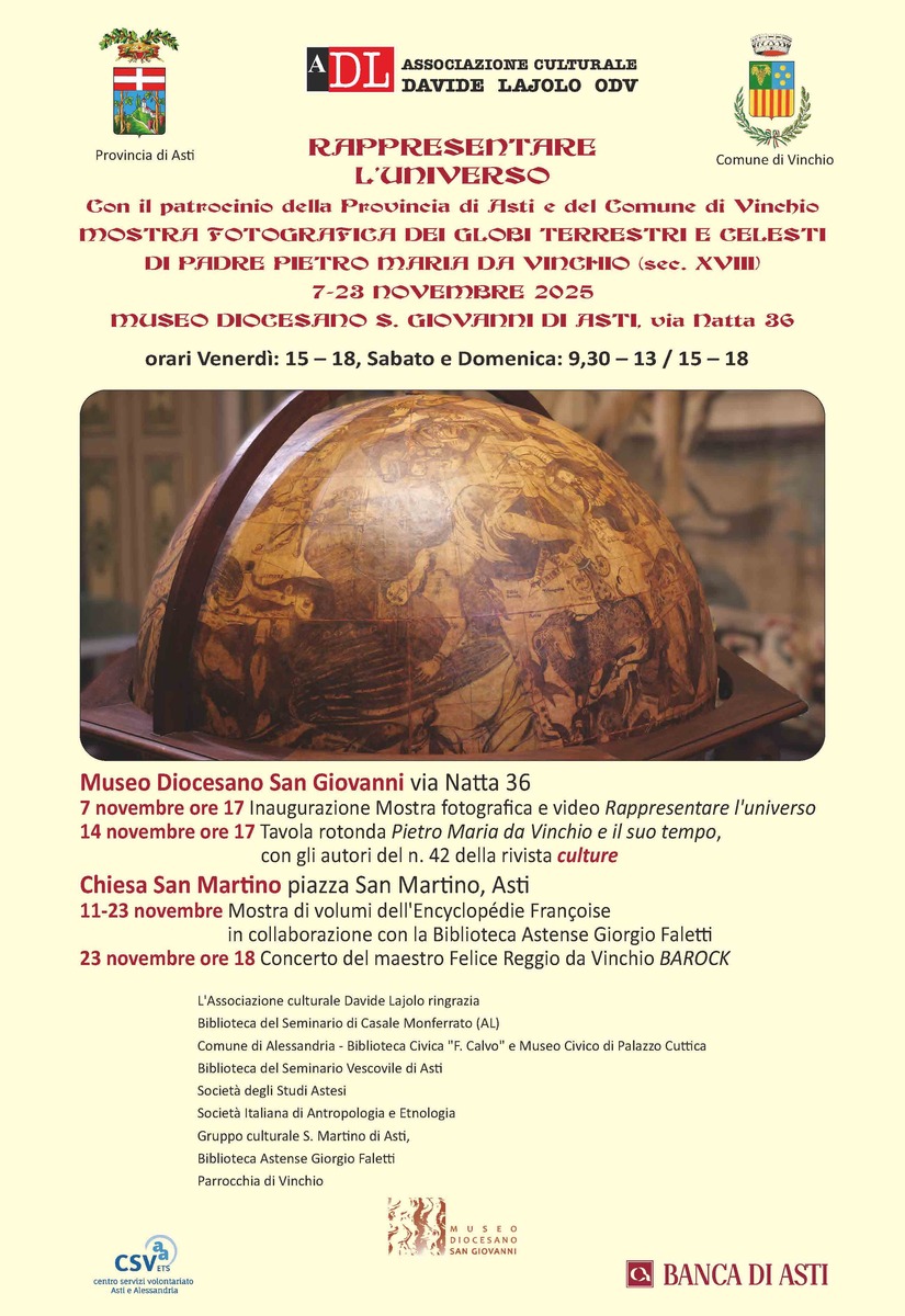 Le iniziative prenderanno il via il 7 novembre, alle 17, con l’inaugurazione, presso il Museo Diocesano San Giovanni di Asti, della mostra fotografica e video “Rappresentare l’universo. I globi terrestri e celesti di Padre Pietro Maria da Vinchio e il suo tempo”. Le foto e il video, realizzati da Lucio Laugelli, illustrano le opere del frate, mappamondi realizzati come vere e proprie opere d’arte. La mostra sarà visitabile fino a 23 novembre, con il seguente orario: venerdì 15-18, sabato e domenica 9:30-13 e 15-18.