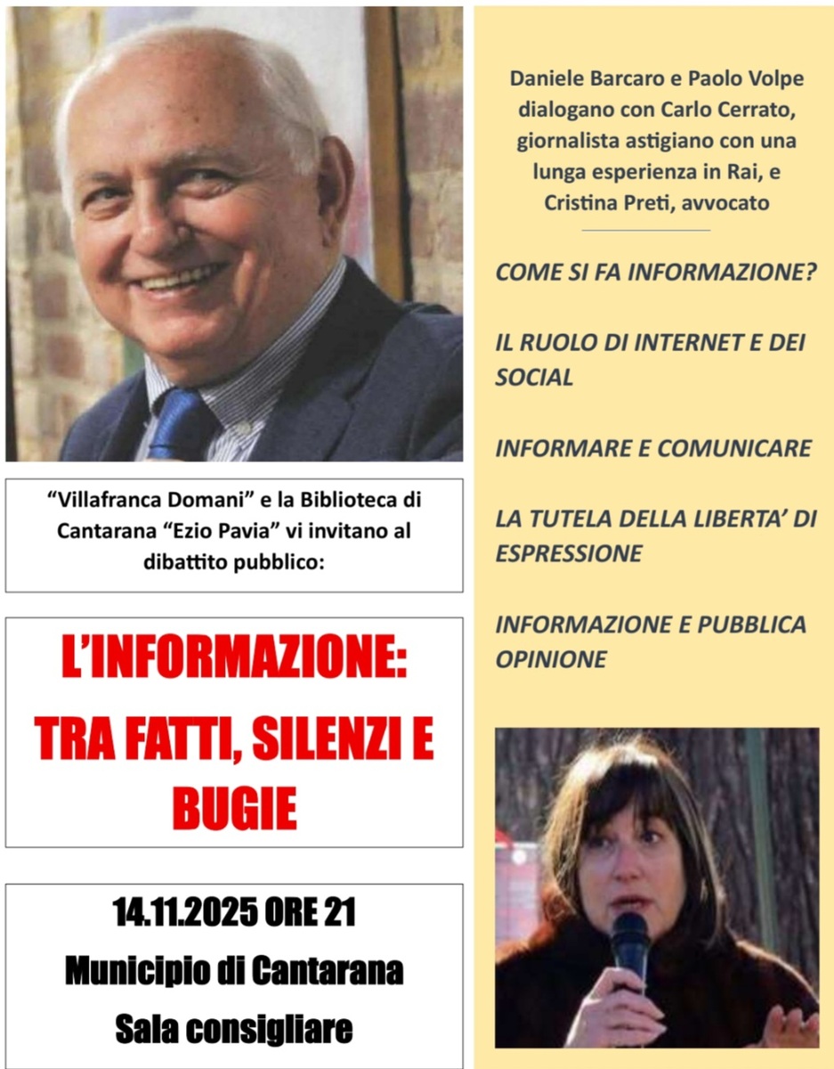 L'evento è organizzato da "Villafranca Domani" e dalla Biblioteca di Cantarana "Ezio Pavia", che invitano la cittadinanza a questo dibattito pubblico aperto a tutti.