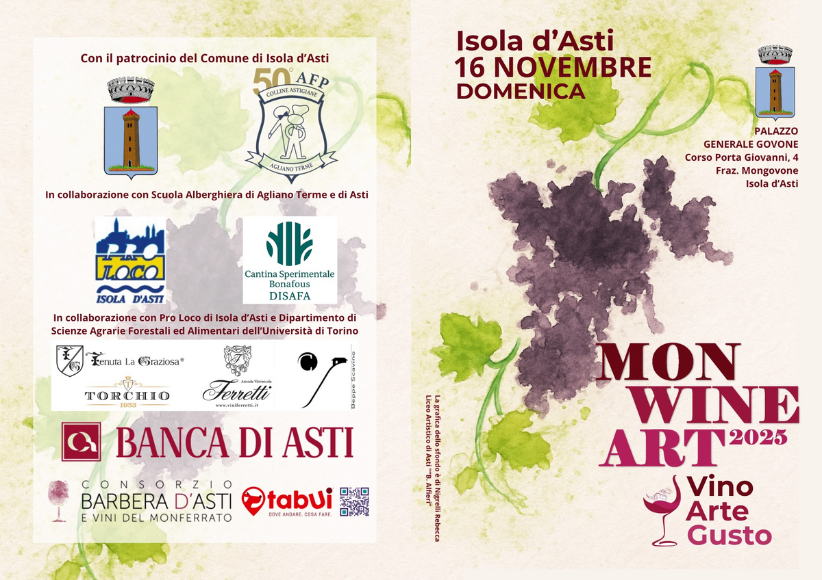 Domenica 16 novembre le sale settecentesche di Palazzo Generale Govone a Mongovone di Isola d'Asti ospiteranno Monwineart 2025, manifestazione che unisce enogastronomia, storia e arte contemporanea. L'evento, patrocinato dal Comune di Isola d'Asti, nasce dalla collaborazione tra la Scuola Alberghiera AFP Colline Astigiane di Agliano Terme e Asti, la Pro Loco di Isola d'Asti, i vignaioli del territorio e il Dipartimento di Scienze Agrarie, Forestali e Alimentari dell'Università di Torino.