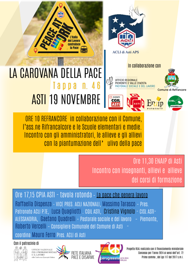In tarda mattinata, la carovana si sposterà ad Asti per un incontro con insegnanti e ragazzi di ENAIP, l'ente di formazione storico delle ACLI, luogo simbolo di lavoro dignitoso, diritti e competenze professionali, ma anche di convivenza civile.