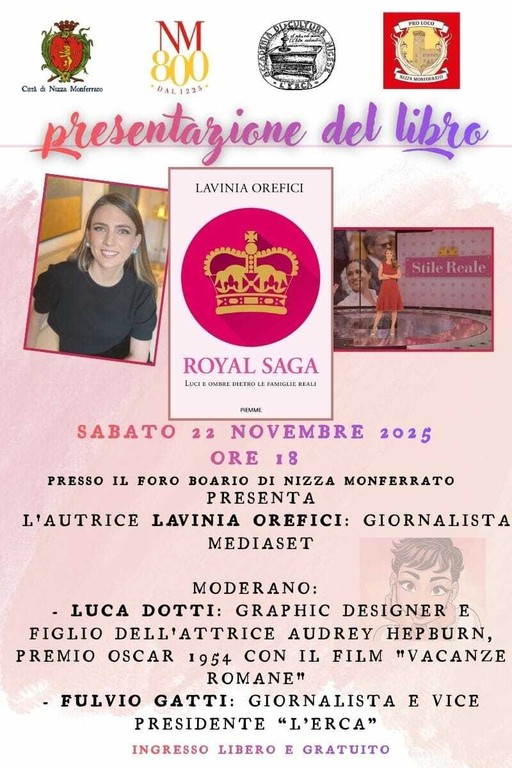 A conclusione della giornata, alle 18, l’Auditorium ospiterà anche la presentazione del libro della giornalista Lavinia Orefici “Royal saga”, in un incontro moderato da Luca Dotti, figlio dell’attrice Audrey Hepburn, e dal giornalista e vicepresidente dell’Erca Fulvio Gatti.