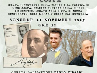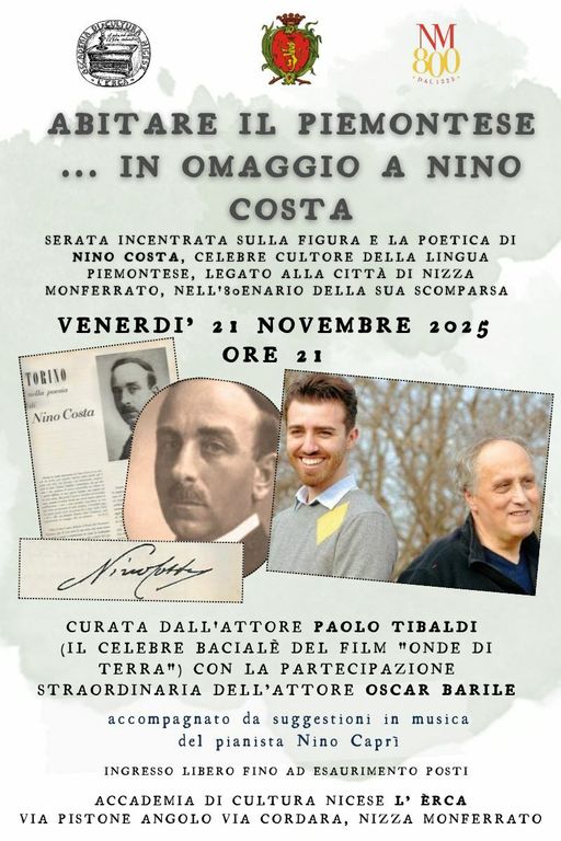 Si partirà venerdì 21 novembre, con la seconda serata di “Abitare il piemontese”, l’evento organizzato dall’Accademia di cultura nicese “L’Erca”, che si terrà alle 21 all’Auditorium Trinità. La serata sarà dedicata a Nino Costa, considerato il più grande poeta piemontese e cultore di questa lingua, fortemente legato a Nizza Monferrato, città d’origine della moglie.