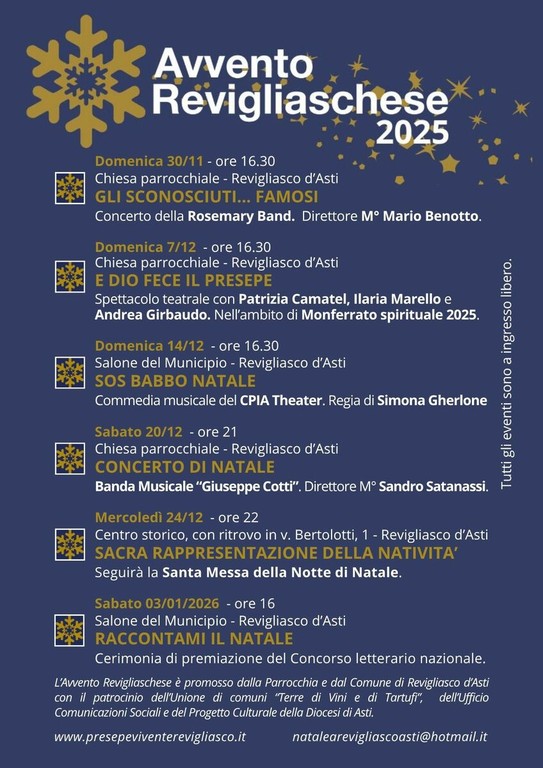 L’Avvento Revigliaschese è patrocinato dall’Unione di Comuni Terre di Vini e di Tartufi, dall’Ufficio Comunicazioni Sociali e dal Progetto Culturale della Diocesi di Asti.