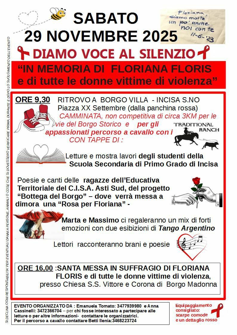 Durante il percorso ci saranno tappe dedicate alle letture, alla mostra degli studenti di Incisa, alla poesia e ai canti delle ragazze dell’Educativa Territoriale del CISA Asti Sud. Inoltre, verrà messa a dimora una “Rosa per Floriana”, all’interno del progetto “Bottega del Borgo”. Successivamente si terranno un’esibizione di tango argentino e le letture di brani e poesie. Alle 16, infine, è prevista la messa dedicata a Floriana e a tutte le donne vittime di violenza.