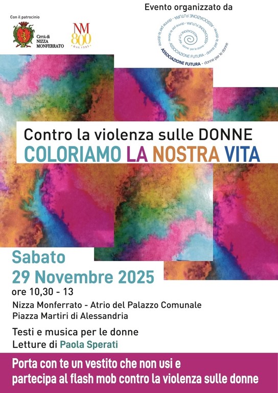 In occasione della settimana della Giornata internazionale per l’eliminazione della violenza contro le donne, sabato 29 novembre, dalle 10.30 alle 13, a Nizza Monferrato si terrà un flash mob che coinvolgerà la cittadinanza in un momento di riflessione e condivisione.