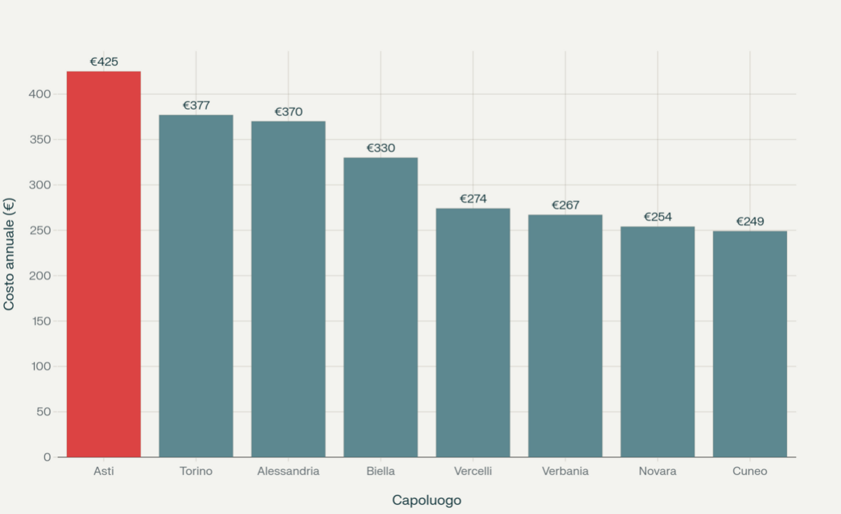 Il dato, seppur pesante in termini assoluti, nasconde però una notizia positiva: Asti è l'unico capoluogo piemontese a vedere la tariffa diminuire rispetto all'anno precedente. Mentre nel resto della regione i costi aumentano mediamente del 3,3% – con picchi del +10,6% a Verbania e del +6,6% a Novara – la bolletta astigiana scende del 2,4% (era 435 euro nel 2024).