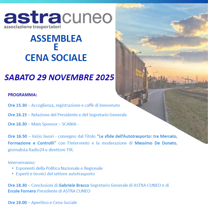 ASTRA Cuneo invita tutti gli associati a partecipare alla Assemblea Generale 2025, in programma sabato 29 novembre presso il Centro Congressi La Porta delle Langhe di Cherasco. Un appuntamento ormai consolidato che rappresenta per l’associazione un passaggio indispensabile per condividere le priorità del settore, favorire il confronto diretto con le istituzioni e rafforzare il senso di comunità tra le imprese di autotrasporto.