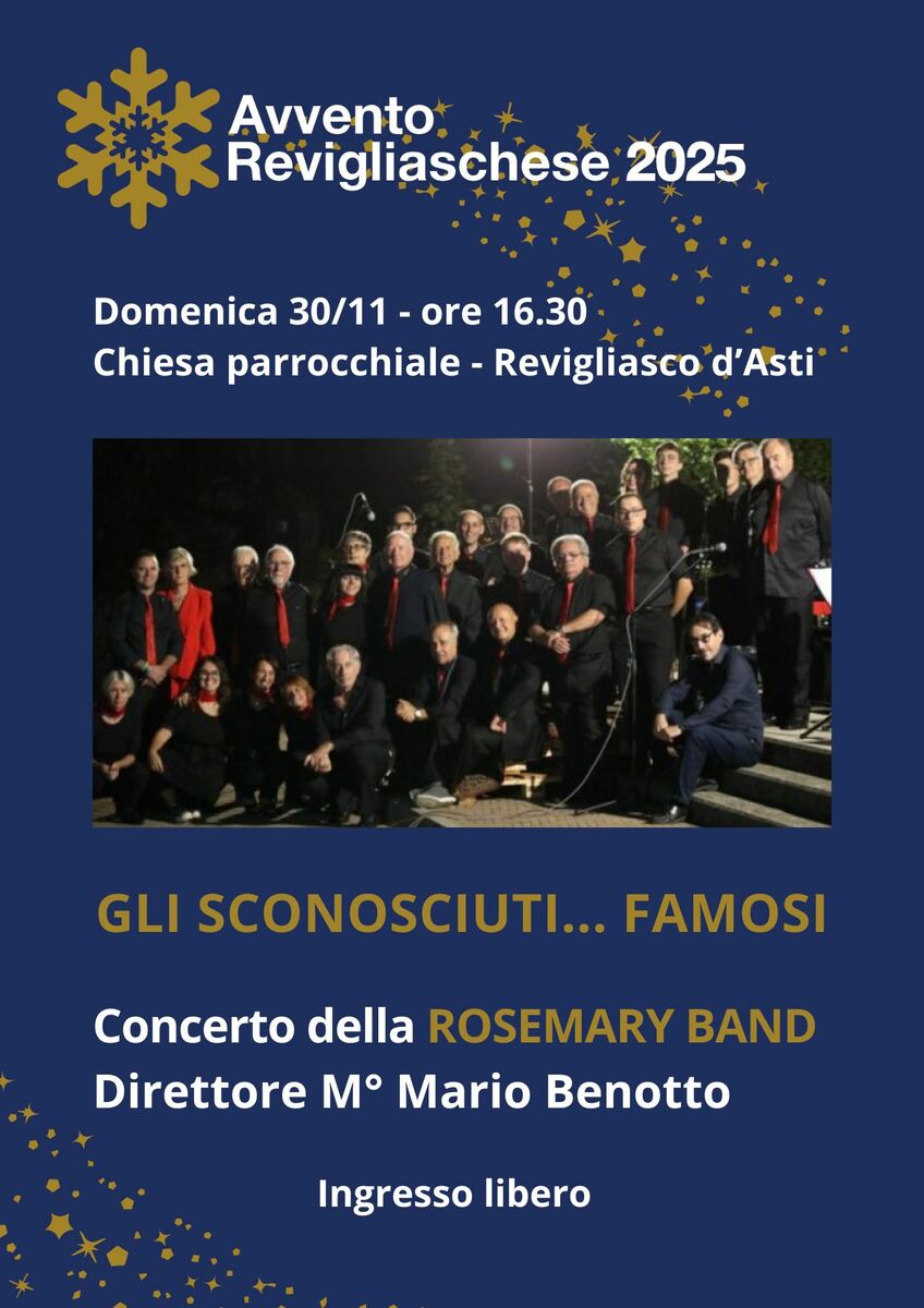Domenica 30 novembre 2025, alle ore 16.30, nella chiesa parrocchiale di Revigliasco d’Asti, la Rosemary Band inaugurerà ufficialmente l’edizione 2025 dell’Avvento Revigliaschese, la rassegna di cultura e spiritualità promossa dal Comune e dalla Parrocchia che scandisce le tappe verso il Natale offrendo momenti di musica, teatro, tradizione e incontro, valorizzando il patrimonio culturale e umano del territorio.