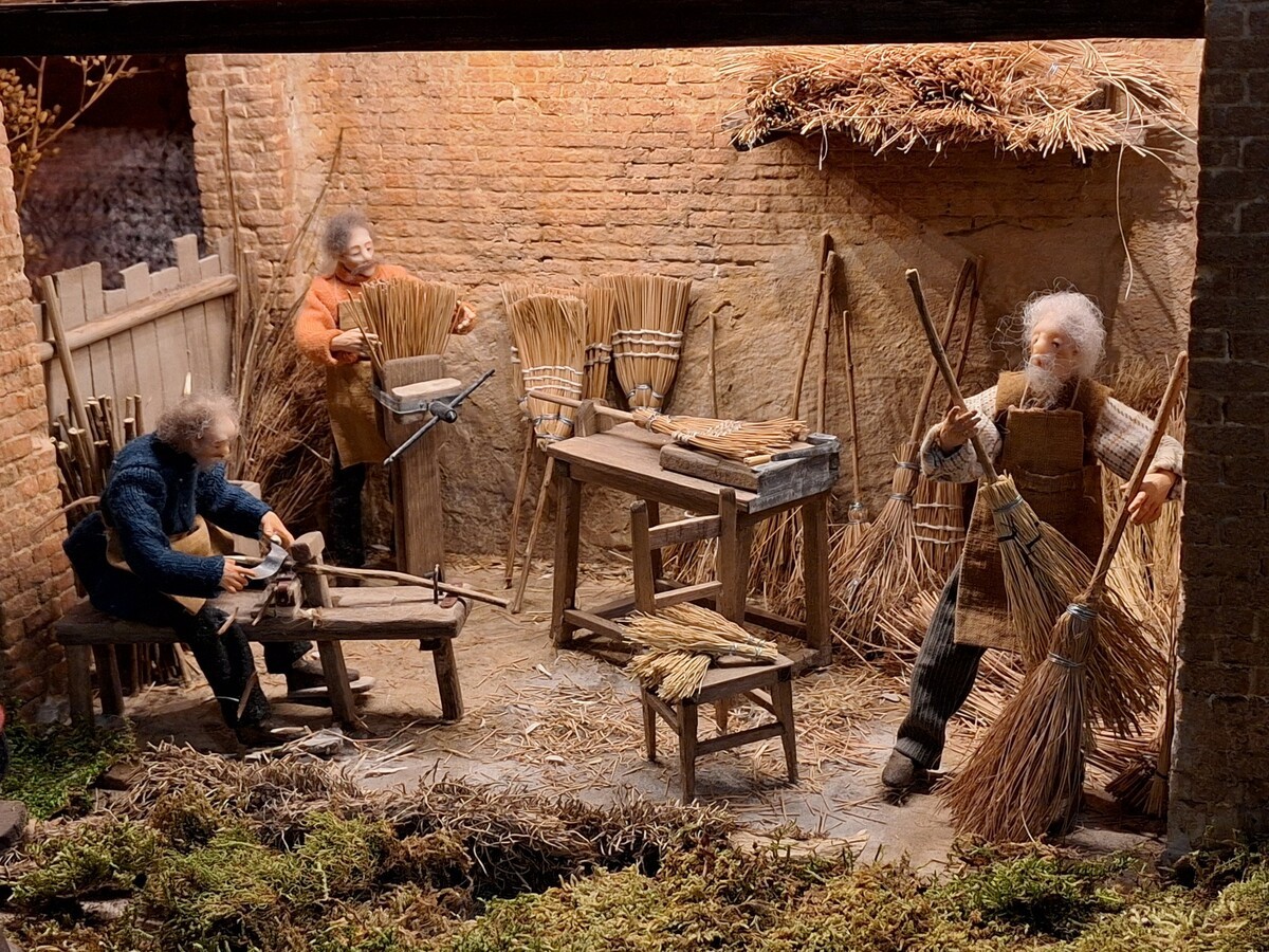 Chi visiterà l’Abbazia di Vezzolano potrà ammirare un microcosmo straordinario di 40 mq: un paese tra la fine dell’Ottocento e l’inizio del Novecento prende vita con oltre 450 personaggi, alti dai 15 ai 30 cm, ognuno unico nelle espressioni, nei gesti e nelle posture. Accanto alle scene del presepe tradizionale si trovano più di 100 botteghe artigiane, antichi mestieri, banchetti, scorci di vita quotidiana e centinaia di minuscoli oggetti - utensili e suppellettili da 1-2 mm fino a 2-3 cm - che rendono l’insieme poetico e straordinariamente realistico.