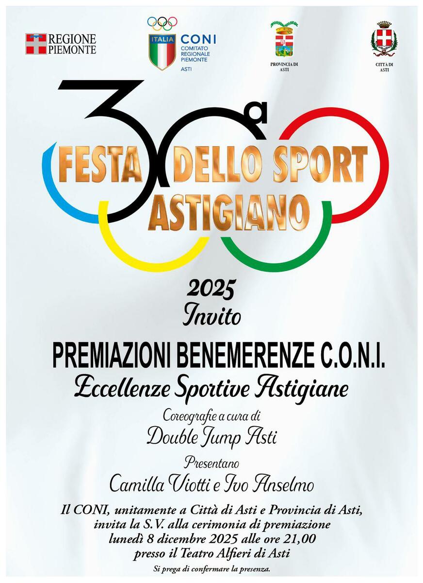 Il sipario del Teatro Alfieri di Asti sta per alzarsi su una delle serate più attese dall'intero movimento sportivo locale. Lunedì 8 dicembre 2025, alle ore 21, andrà in scena la 30ª Festa dello Sport Astigiano, un traguardo storico per la cerimonia organizzata dal Coni in sinergia con la Regione Piemonte, la Provincia e la Città di Asti. Sarà una vera e propria parata di stelle, guidata dai conduttori Camilla Viotti e Ivo Anselmo, con le coreografie curate dall'ASD Double Jump Asti ad arricchire lo spettacolo. Al centro della scena ci saranno le eccellenze sportive, i titoli mondiali e le benemerenze che raccontano un anno di fatiche e trionfi.