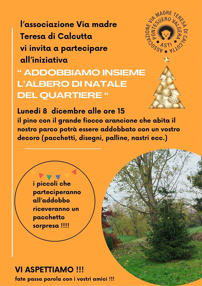 L'associazione Via Madre Teresa di Calcutta, Pontesuero e Valgera, da anni impegnata nel volontariato e nella cura del territorio astigiano, ha lanciato l'appello “Adotta l'albero del quartiere”, un'iniziativa natalizia che raduna i vicini per decorare un maestoso pino nel parco con materiali recuperati.
