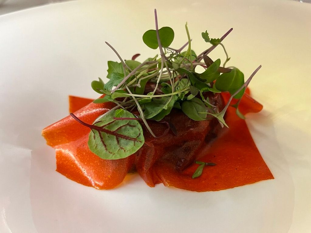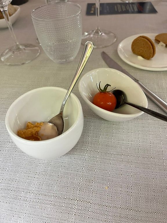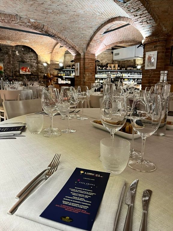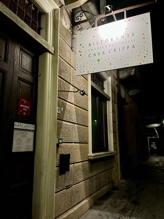 Ho il privilegio di 'ripassarne' la filosofia in occasione di una cena inserita all'interno del tour gourmet del Canelli, che ha fatto sosta a Casa Crippa. A condurre la degustazione Davide Canina, in veste di sommelier e ambasciatore del Canelli Docg. Il menù è ancora una volta sorprendente: animella di vitello al burro, scalogno, rosmarino e miele di castagno; risotto al moscato, agrumi, capperi, salvia e olive; aletta di vitello, composta di pomodoro barbecue; sorbetto al vermouth e mandarino e infine ganache al caramello e arachide, gelato alla banana e pop corn. La maestria dello chef Diego si incrocia perfettamente con l'aromaticità insolita del Canelli, in abbinamento, in varie annate e cantine, a ogni piatto. Il tutto, servito all’interno di una delle antiche cantine sotterranee di Canelli della metà dell’Ottocento. Si degusta immersi nella storia della capitale spumantiera del Piemonte, anche grazie alle mani esperte di una cucina che dal 2006 sa di famiglia e di tradizioni fuori dagli schemi.