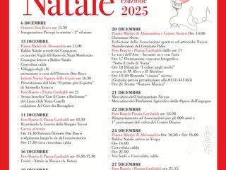 Sabato 20 dicembre, in piazza Martiri di Alessandria e nel centro storico, prenderà il via il “Christmas Show” con le esibizioni delle associazioni sportive e artistiche locali e degli sbandieratori del Comitato Palio. Nel pomeriggio, al foro boario, si svolgeranno “Le voci dell’Arte”, la premiazione del concorso fotografico “Sotto il cielo di Nizza” e il dibattito “I colori negli occhi” a cura di Massimo Ricci e Giuseppe Baldino, seguito da una merenda “sinòira” e da una serata di “Teatro e Musica”.