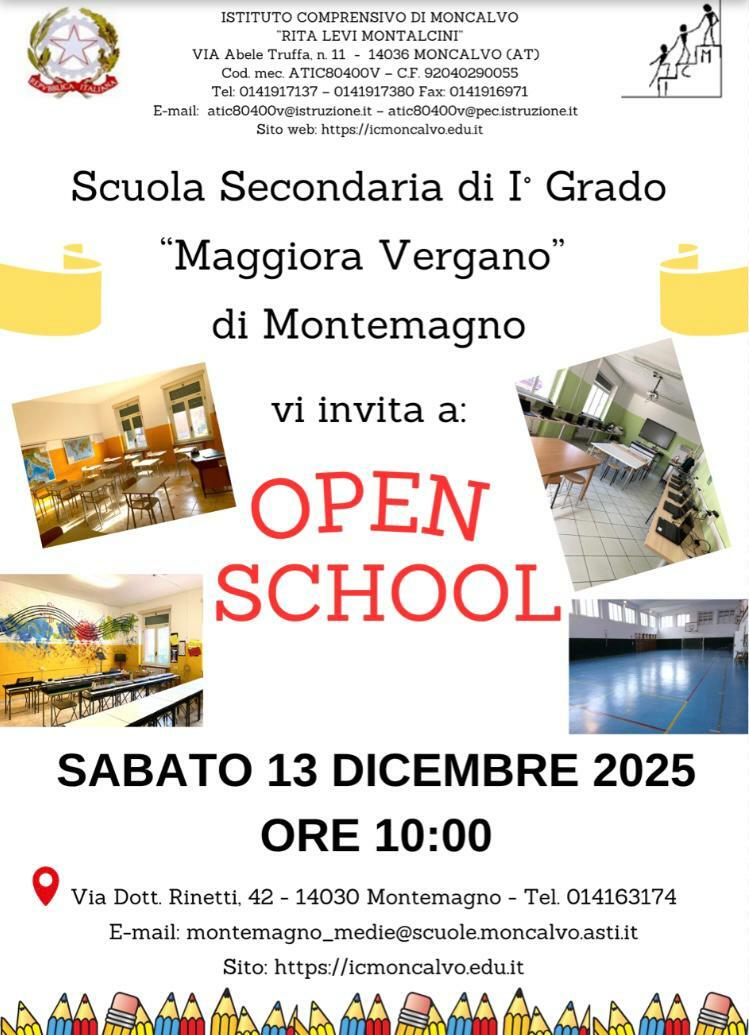 Si ricorda inoltre l’open school di sabato 13 alle 10, durante il quale sarà possibile incontrare i docenti e visitare i locali della Scuola Secondaria di Primo Grado “Maggiora Vergano”.
