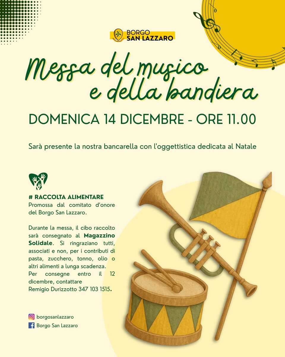 Domenica 14 dicembre, come da tradizione, il Borgo San Lazzaro celebrerà il Natale con la Messa del Musico e della Bandiera, appuntamento che vedrà la partecipazione del fantino Giuseppe Zedde, detto Gingillo, per gli auguri alla comunità. La celebrazione, in programma alle ore 11.00, sarà animata dalla corale di San Domenico Savio e dai suoi musicisti, affiancati dal gruppo musici del Borgo. Tamburi, chiarine e sbandieratori sottolineeranno i momenti salienti della funzione con esibizioni d’arte della bandiera e intermezzi musicali all’interno della chiesa.