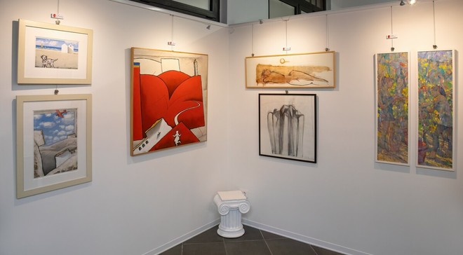 L’esposizione riunisce una serie di illustrazioni caratterizzate da figure marine e atmosfere immaginate, con uno stile immediato e riconoscibile.