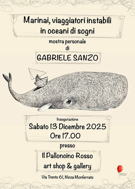 Sabato 13 dicembre, alle 17, il Palloncino Rosso art shop & gallery di Nizza Monferrato ospiterà l’inaugurazione della mostra personale di Gabriele Sanzo, intitolata “Marinai, viaggiatori instabili in oceani di sogni”.