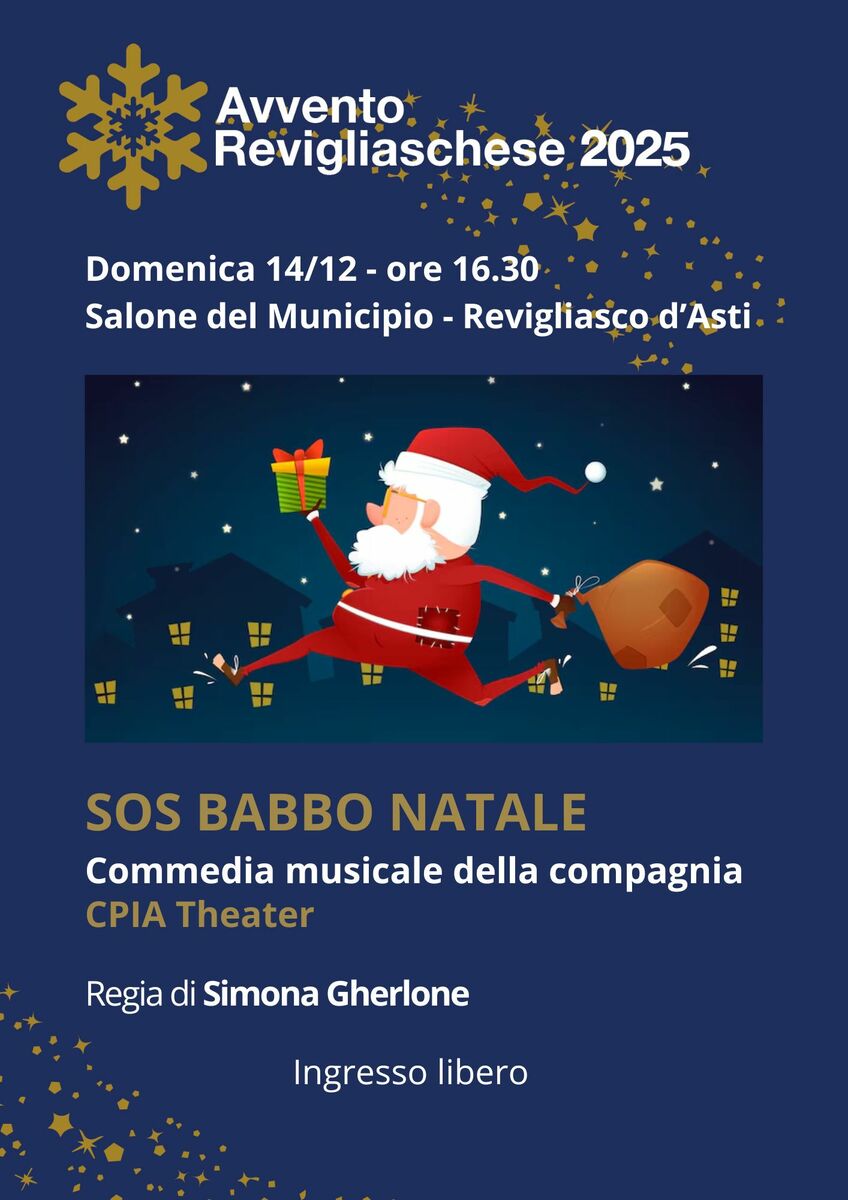 Il cammino dell’Avvento Revigliaschese prosegue domenica 14 dicembre, alle 16.30, con il terzo appuntamento della rassegna. Questa volta il palcoscenico sarà il Salone del Municipio di Revigliasco d’Asti, che ospiterà la commedia musicale “SOS Babbo Natale” portata in scena dalla compagnia CPIA Theater, con la regia di Simona Gherlone. L’ingresso è libero.