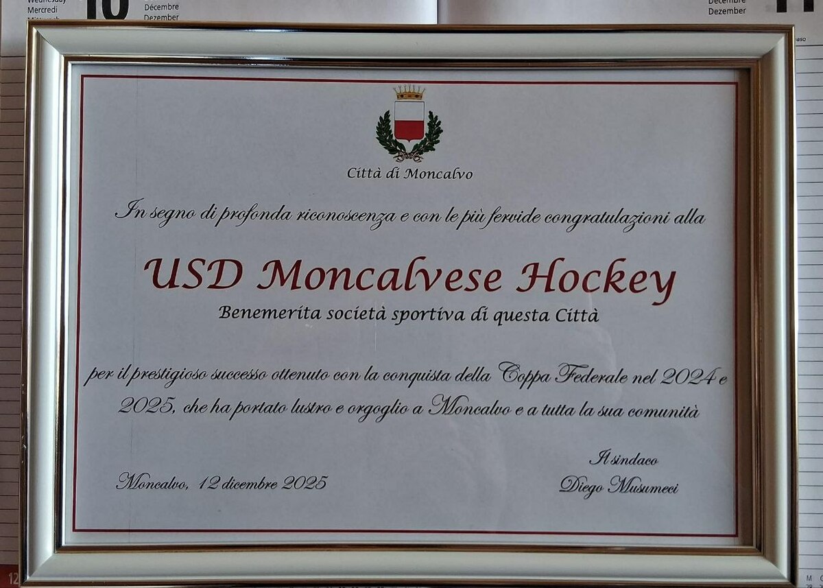 Non è solo una vittoria sportiva, ma la conferma di una tradizione che scorre nelle vene della cittadina. Nel pomeriggio di ieri, venerdì 12 dicembre, il palazzo municipale di Moncalvo ha aperto le sue porte alla USD Moncalvese Hockey, protagonista di una stagione straordinaria culminata con la conquista della Coppa Federale nazionale. Un successo che bissa quello ottenuto l'anno precedente, consolidando il sodalizio moncalvese ai vertici della categoria.