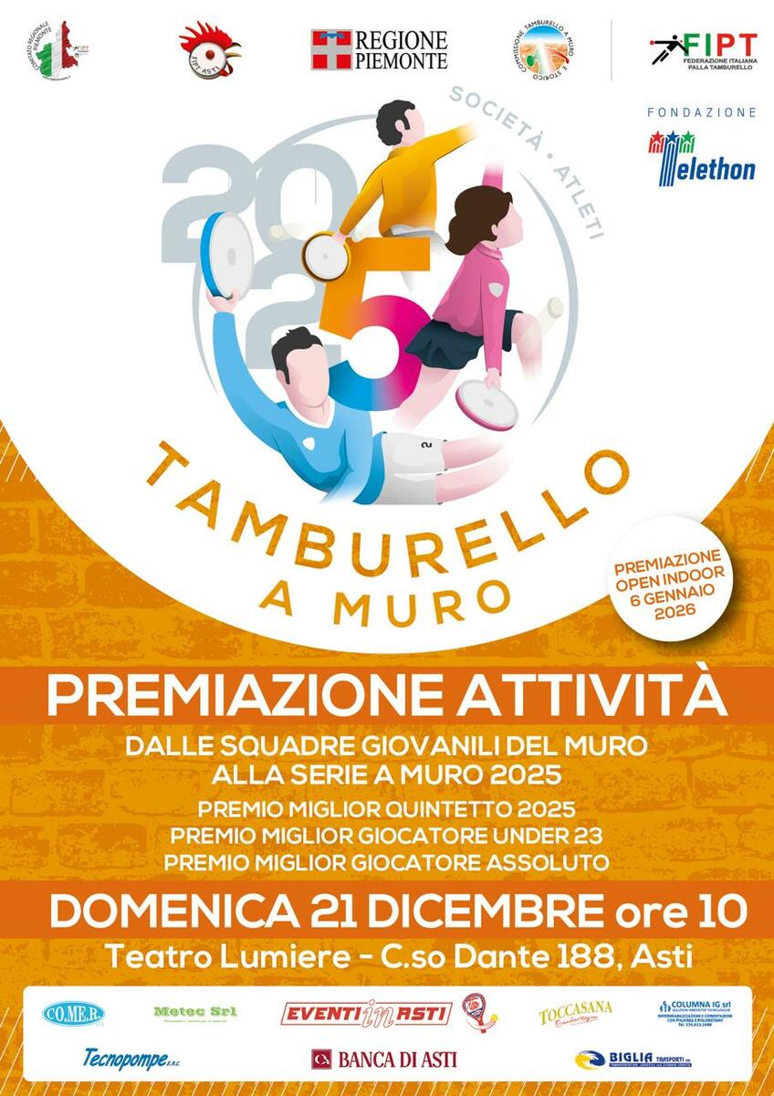 Un appuntamento prenatalizio per celebrare i campioni. Il mondo del tamburello a muro si ritroverà domenica 21 dicembre, a partire dalle ore 10, presso il Teatro Lumière di Asti per la tradizionale premiazione dell'attività piemontese 2025. L'evento, organizzato con il Patrocinio della Banca di Asti, è stato convocato da Mimmo Basso, presidente del Comitato Fipt Asti e della CMS Commissione Muro, e da Riccardo Bonando, Presidente del Comitato Fipt Piemonte.