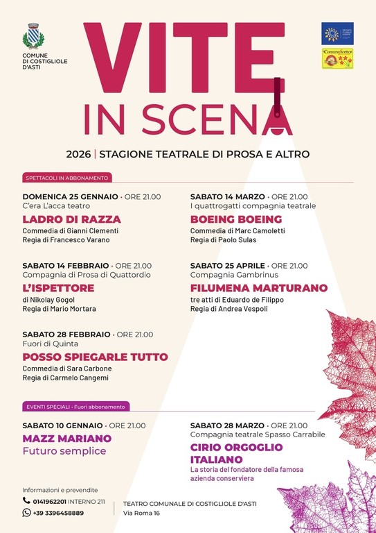 “Con enorme soddisfazione annuncio che, dopo un periodo di attesa, ritorna la stagione teatrale a Costigliole d’Asti. Si rialza il sipario del nostro bellissimo e storico teatro, che tornerà ad accendersi da gennaio ad aprile con la rassegna “Vite... in Scena” - ha dichiarato il sindaco Enrico Alessandro Cavallero - Sette appuntamenti dedicati alla commedia teatrale, in cui il palcoscenico diventa specchio di vitalità, luogo d’incontro, identità e condivisione: un valore sociale di grande rilievo per tutta la nostra comunità”.