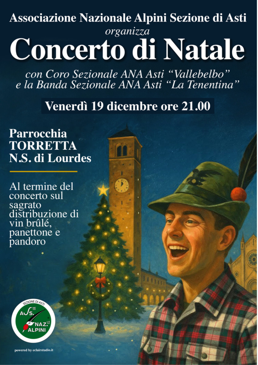 Durante l’evento, saranno eseguiti brani della tradizione natalizia e alpina dal Coro ANA Valle Belbo, diretto dalla maestra Orietta Lanero, e dalla Banda della Sezione di Asti “La Tenentina”, diretta dal maestro Pier Cesare Lavagnolo.