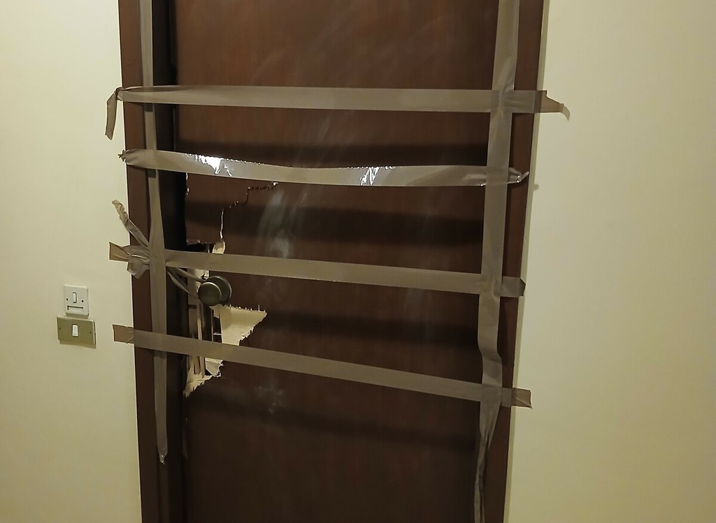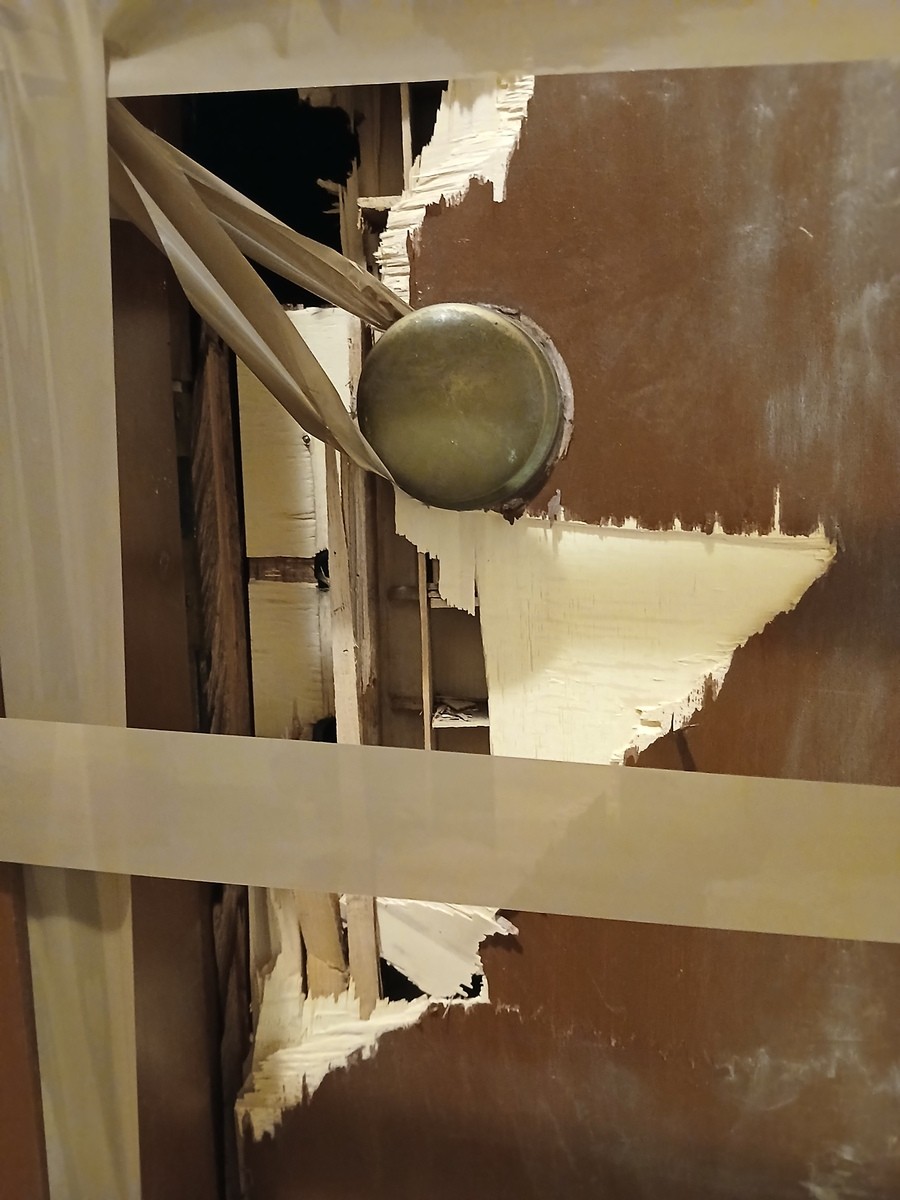 I malviventi hanno forzato violentemente la porta d'ingresso, danneggiando il legno e la serratura nel tentativo di aprirsi un varco, come testimoniano i segni di scasso sull'infisso ora riparato provvisoriamente.