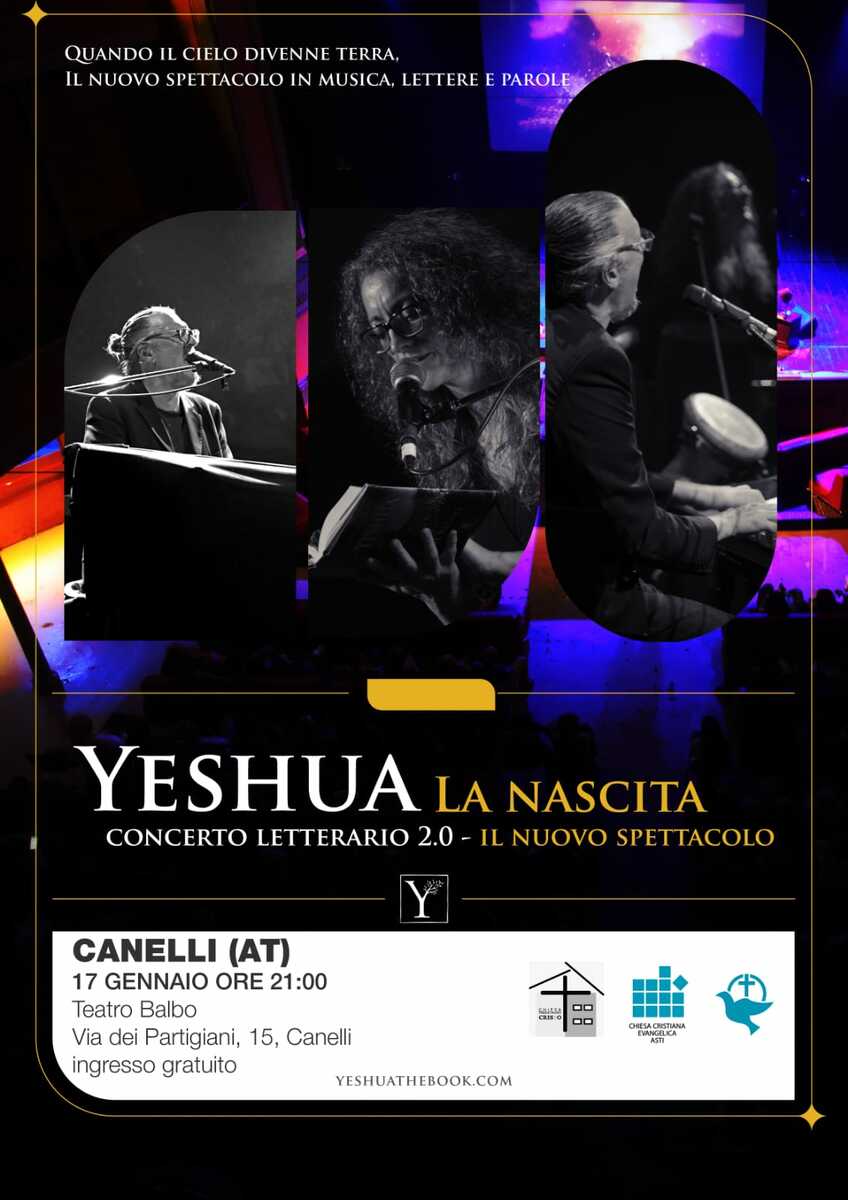 Sabato 17 gennaio, il Teatro Balbo di Canelli vedrà in scena l’originale rappresentazione “Yeshua. La nascita - Concerto letterario 2.0”, un complesso di musiche, pensieri e letture tratti dai libri “Yeshua. Il regno”, “Yeshua. La fuga” e “Yeshua. La nascita", i primi tre volumi di una quadrilogia scritta da Stefano Rigamonti (yeshuathebook.com), dedicata interamente alla storia di Gesù Cristo.