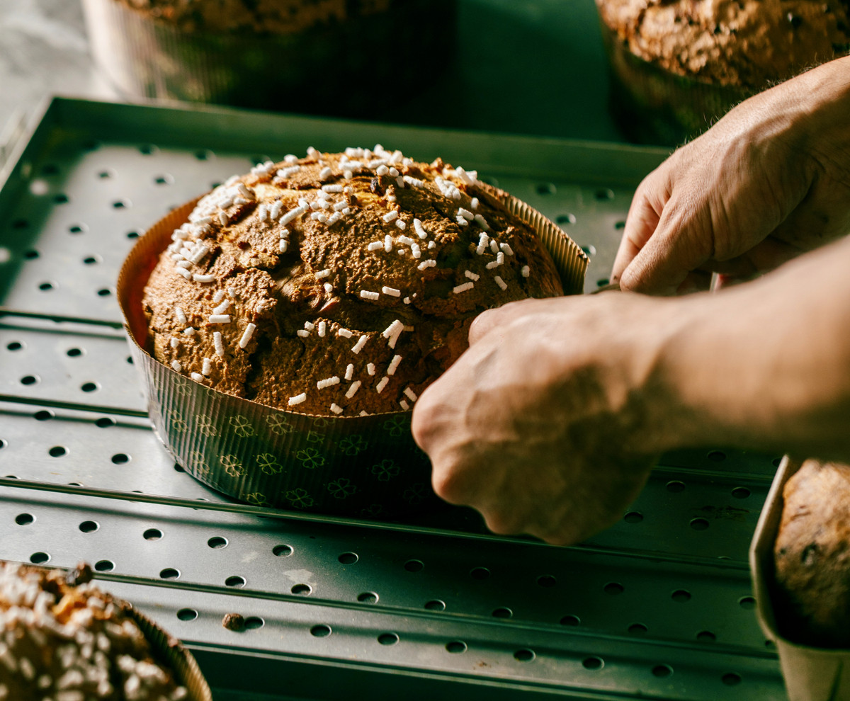 Nel laboratorio di Cibrario Forno Contemporaneo, in questo caso non una pasticceria ma una panetteria di moderna concezione, Jacopo Pistone produce in questo periodo anche un panettone tradizionale di spicco. Diverso dai classici milanesi, questo dolce compatto e aromatico segue la tradizione “torinese”, caratterizzata da una consistenza più piena e da un profumo avvolgente. L’impasto, preparato con lievito madre e lasciato a riposare per 70 ore, trova il suo equilibrio grazie al rispetto meticoloso dei tempi previsti. Burro, uova e farine italiane selezionate conferiscono al lievitato in questione un sapore complessivamente equilibrato, mentre l’arancia candita dell’Agrimontana e l’uvetta aggiungono dolcezza e aromaticità, integrandole nell’impasto in modo decisamente convincente. Ogni pezzo è modellato a mano, con alveolatura regolare e proporzioni precise. La cottura lenta crea una crosta dorata e leggermente croccante che racchiude un interno in cui consistenza e morbidezza trovano un loro riuscito equilibrio. Il risultato finale trasmette immediatamente al palato un senso di compatta solidità, destinata tuttavia a sfumare rapidamente in una sofficità ben percepibile anche nel retrogusto finale. Un lievitato riuscito dunque, da non perdere soprattutto per chi ama la declinazione torinese di questo dolce.