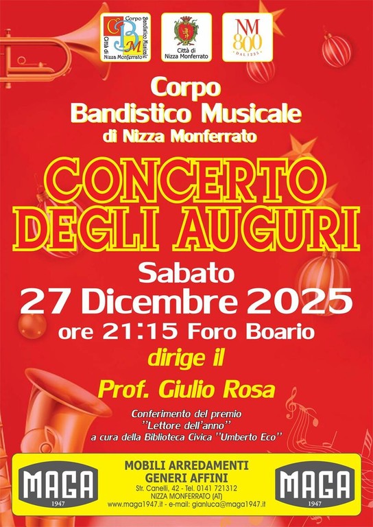 Sabato 27 dicembre, il Corpo Bandistico Musicale di Nizza Monferrato terrà il tradizionale “Concerto degli auguri”, una serata dedicata alla cittadinanza e alla musica per festeggiare e salutare il 2025.