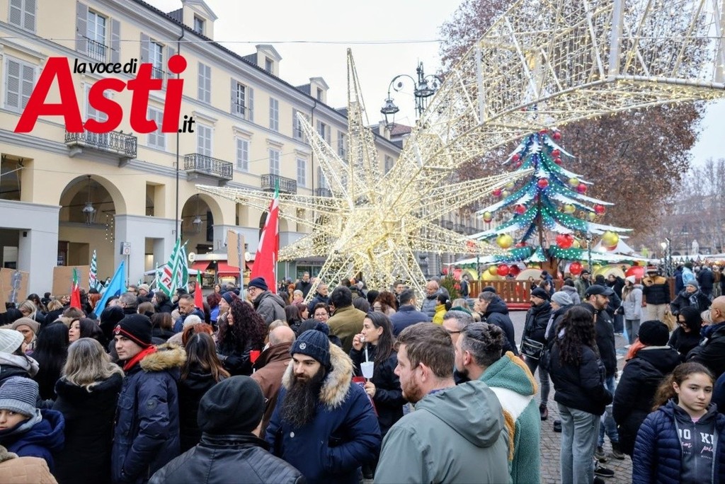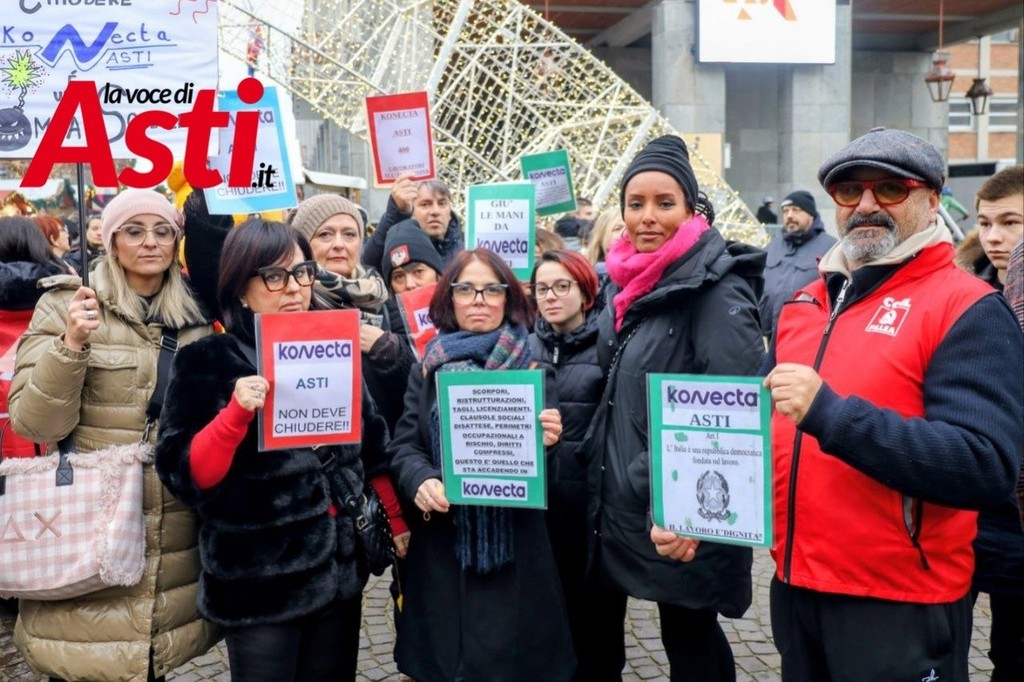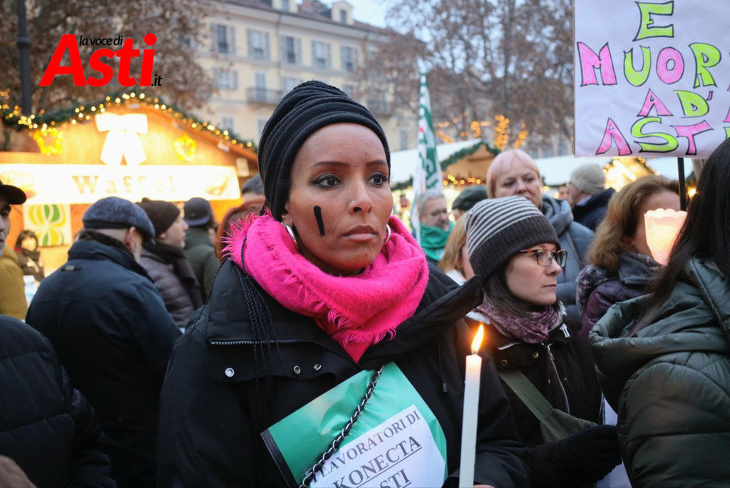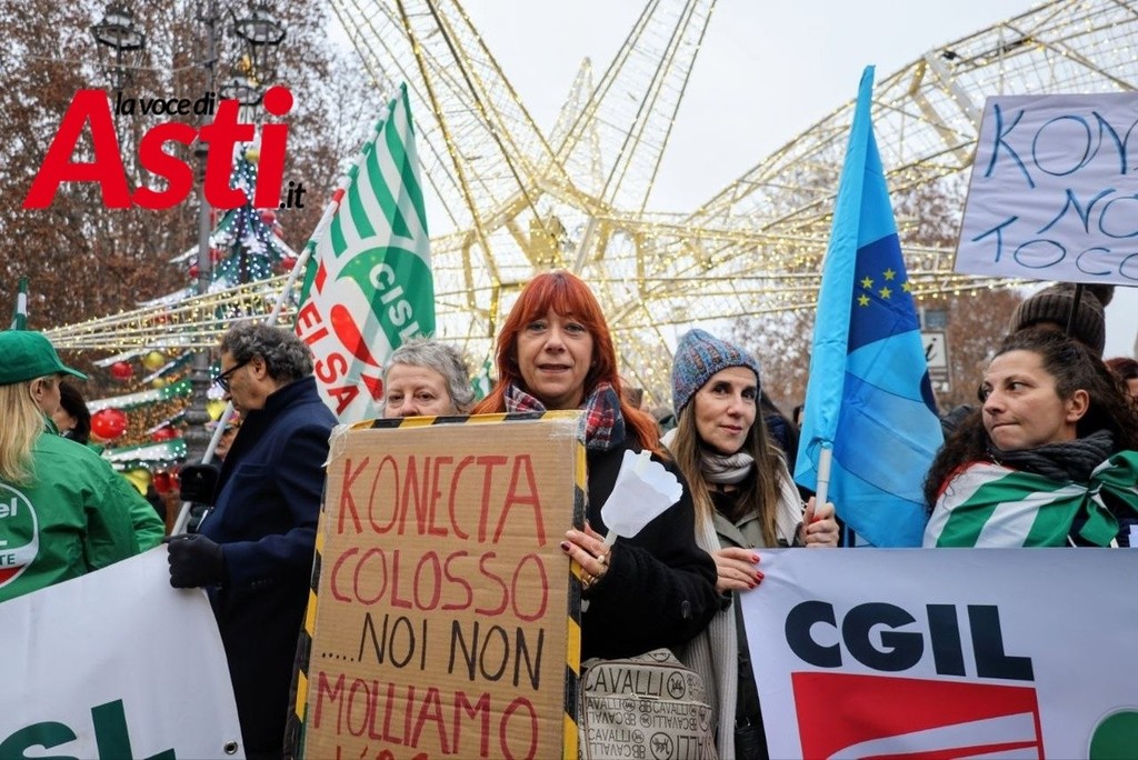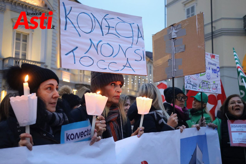 Fiaccole, o meglio smartphone accesi tra le casette di legno che si spegnevano per l'ultima volta. Cartelli e striscioni sotto le luminarie natalizie. L'ultimo pomeriggio del Magico Paese di Natale ad Asti si è trasformato in una manifestazione di rabbia e speranza, con la fiaccolata organizzata dai sindacati per protestare contro la decisione di Konecta di chiudere la sede astigiana e trasferire circa 400 lavoratori a Torino.