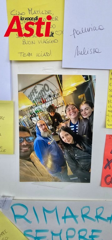 Sul pannello bianco campeggia una foto dietro al bancone, Matilde in felpa tra colleghi e amici; tutto intorno una costellazione di post‑it, firme e pensieri dei tanti lavoratori dei negozi del centro commerciale che l' hanno conosciuta e che spesso la incontravano in una pausa caffè: “Ciao Matilde, ricorderemo per sempre il tuo sorriso, buon viaggio”, e altri aggiungono “non ti dimenticheremo mai” e “rimarrai sempre con noi”.
