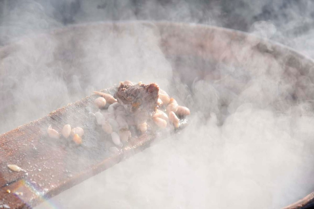 Cottura dalla primissima mattina in una quarantina di grossi paioli di rame, su fuoco a legna, con qualche quintale di fagioli, arricchiti da costine e cotiche di maiale.