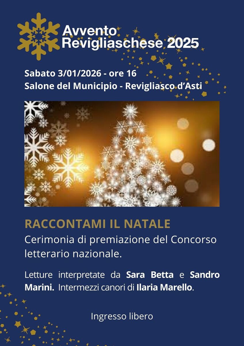Il calendario delle festività si avvia alla conclusione, ma lascia spazio a un ultimo appuntamento dedicato alla cultura e alla riflessione. Domani, sabato 3 gennaio 2026, il Salone del Municipio di Revigliasco d'Asti ospiterà l'atto finale dell'Avvento Revigliaschese 2025 con la cerimonia di premiazione della sesta edizione del concorso letterario nazionale "Raccontami il Natale".