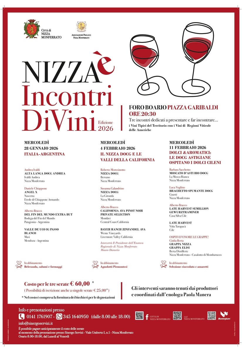 Reduce da un anno ricco di eventi e iniziative, la città si prepara a nuovi appuntamenti partendo da “Nizza è Incontri DiVini”, il format dedicato ai vini del mondo che negli anni ha dimostrato capacità di rinnovarsi senza perdere l’identità che contraddistingue i prodotti del territorio. La nona edizione così si configura come il primo evento nicese presentato per l’anno nuovo, con un confronto sul mondo del vino strutturato in tre serate, tutte dalle 20.30 al foro boario Pio Corsi: il 28 gennaio "Italia–Argentina", il 4 febbraio una serata interamente dedicata al Nizza DOCG, e l’ultimo appuntamento, l’11 febbraio, riservato a vini dolci e aromatici, con la presenza speciale delle distillerie Berta.