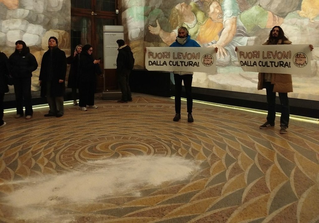 C'è anche un astigiano protagonista della nuova azione dimostrativa del collettivo No Food No Science a Palazzo Te a Mantova. Domenica scorsa, a distanza di un anno dalla protesta che vide l’imbrattamento con letame di una teca di Picasso, alcuni attivisti hanno aperto striscioni contro il salumificio Levoni e hanno cosparso di farina il pavimento della Sala dei Giganti, lanciando anche finte banconote.
