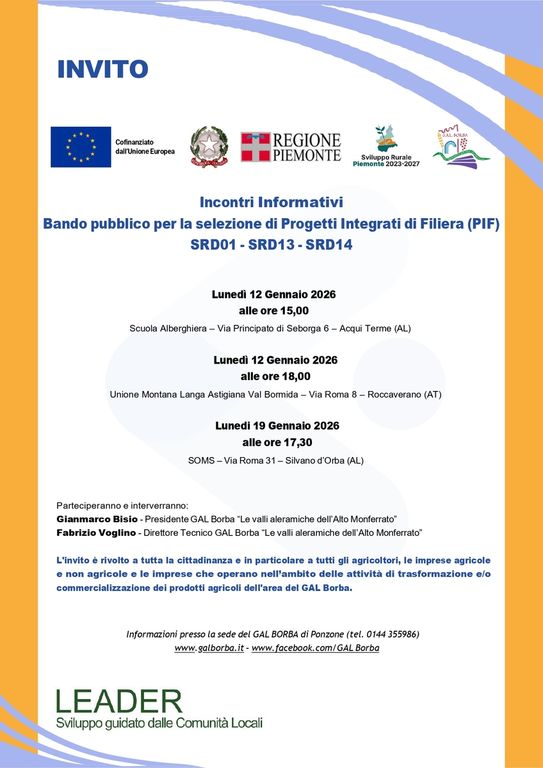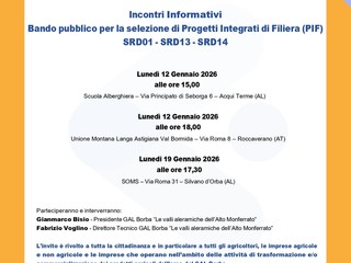 L’evento informativo è in programma per lunedì 12 gennaio alle 18, nella sede dell’Unione Montana Langa Astigiana Val Bormida, dove verranno illustrati i progetti per rafforzare la produttività e la competitività del comparto agricolo-alimentare dell’Alto Monferrato e della Langa astigiana, con progetti che coinvolgono almeno tre soggetti, inclusi beneficiari diretti. A illustrare le nuove opportunità in campo saranno Gianmarco Bisio, presidente del GAL Borba, e Fabrizio Voglino, direttore tecnico.