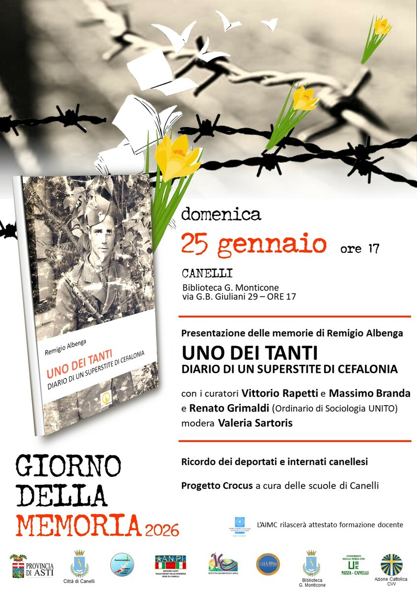 Il cuore dell’evento sarà la presentazione del volume di memorie "Uno dei tanti. Diario di un superstite di Cefalonia", di Remigio Albenga (IGE, 2026). Interverranno Vittorio Rapetti e Massimo Branda, curatori del libro per conto dell’associazione Memoria Viva Canelli, e Renato Grimaldi, ordinario di Sociologia all’Università di Torino e autore dell’introduzione. Modererà l’incontro la professoressa Valeria Sartoris.