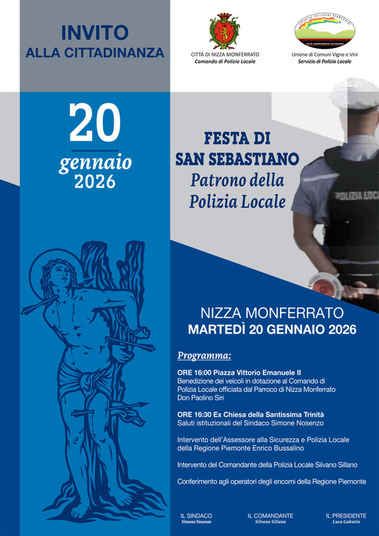 A Nizza Monferrato la ricorrenza sarà celebrata martedì 20 gennaio, con la presenza dell’assessore regionale alla Sicurezza e Polizia Locale Enrico Bussalino.