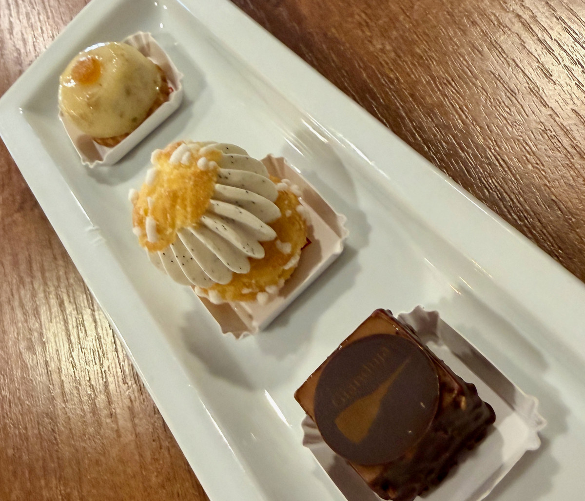 A riscattare quest’ ultimo assaggio arriva un mix di pasticcini: Fondente: una vera boccata d’aria al cioccolato; Sicilia: limone allo stato puro; Chantilly: panna golosa e sorprendentemente fresca; Minipastiera: riuscitissima nell’evocare il famoso dolce napoletano, ma giocata su una nota di grande leggerezza.