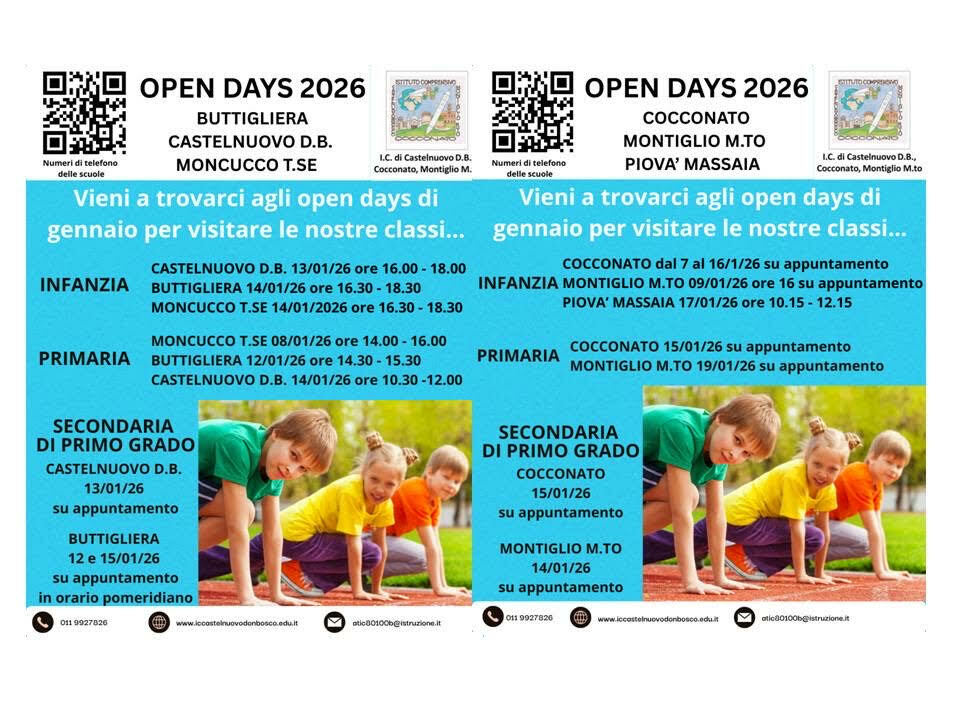 L’Istituto Comprensivo di Castelnuovo Don Bosco, Cocconato, Montiglio comunica che le proprie scuole sono nuovamente aperte nel mese di gennaio per la presentazione dell’offerta Formativa.