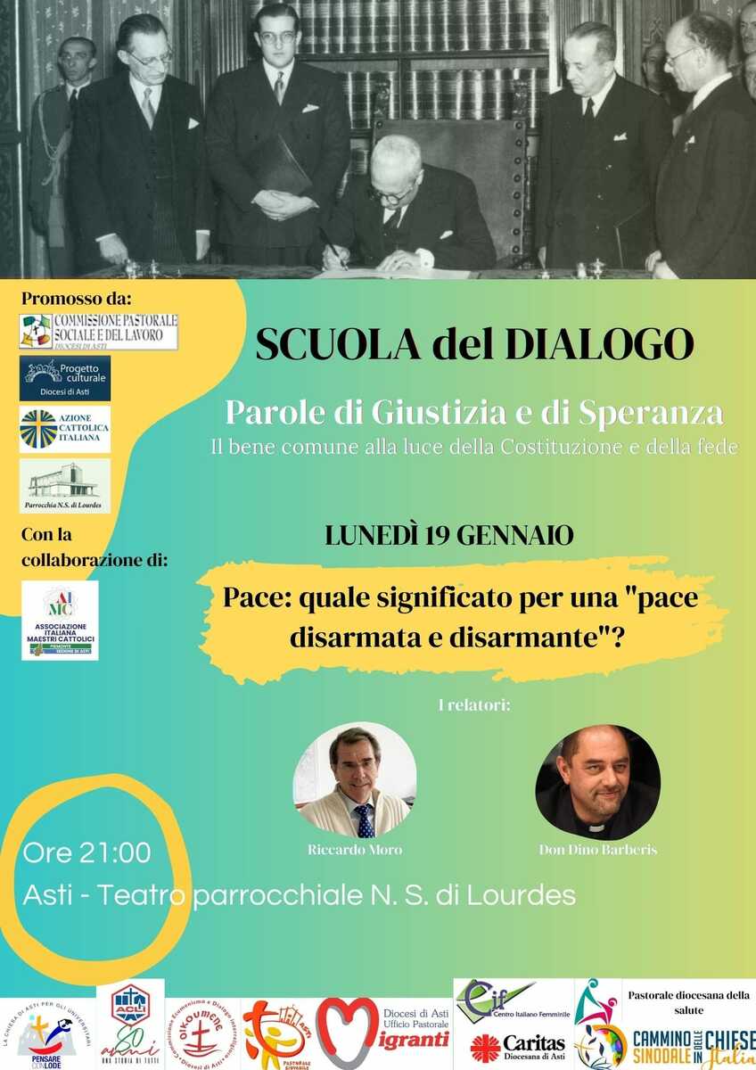 Il secondo incontro, dedicato al tema “Pace: quale significato per una ‘pace disarmata e disarmante’?”, si terrà lunedì 19 gennaio alle 21 nel teatro parrocchiale N.S. di Lourdes. Relatore sarà Riccardo Moro, professore di Development policies all'Università degli Studi di Milano e direttore della Fondazione Giustizia e Solidarietà, che analizzerà i riferimenti alla pace presenti nella Costituzione, evidenziando gli atteggiamenti richiesti oggi ai cittadini e offrendo una lettura geopolitica per comprendere le prospettive globali della pace.