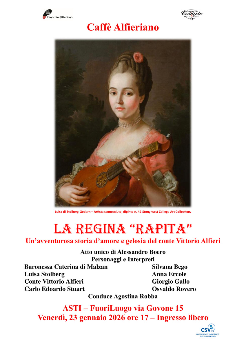 Un tuffo nella storia tra ironia, intrighi e amori tormentati. È il cuore del prossimo appuntamento con il Caffè alfieriano, previsto per venerdì 23 gennaio alle ore 17. La cornice dell'evento sarà lo spazio del Fuoriluogo, dove il Cenacolo Alfieriano porterà in scena un suggestivo atto unico intitolato "La Regina rapita".