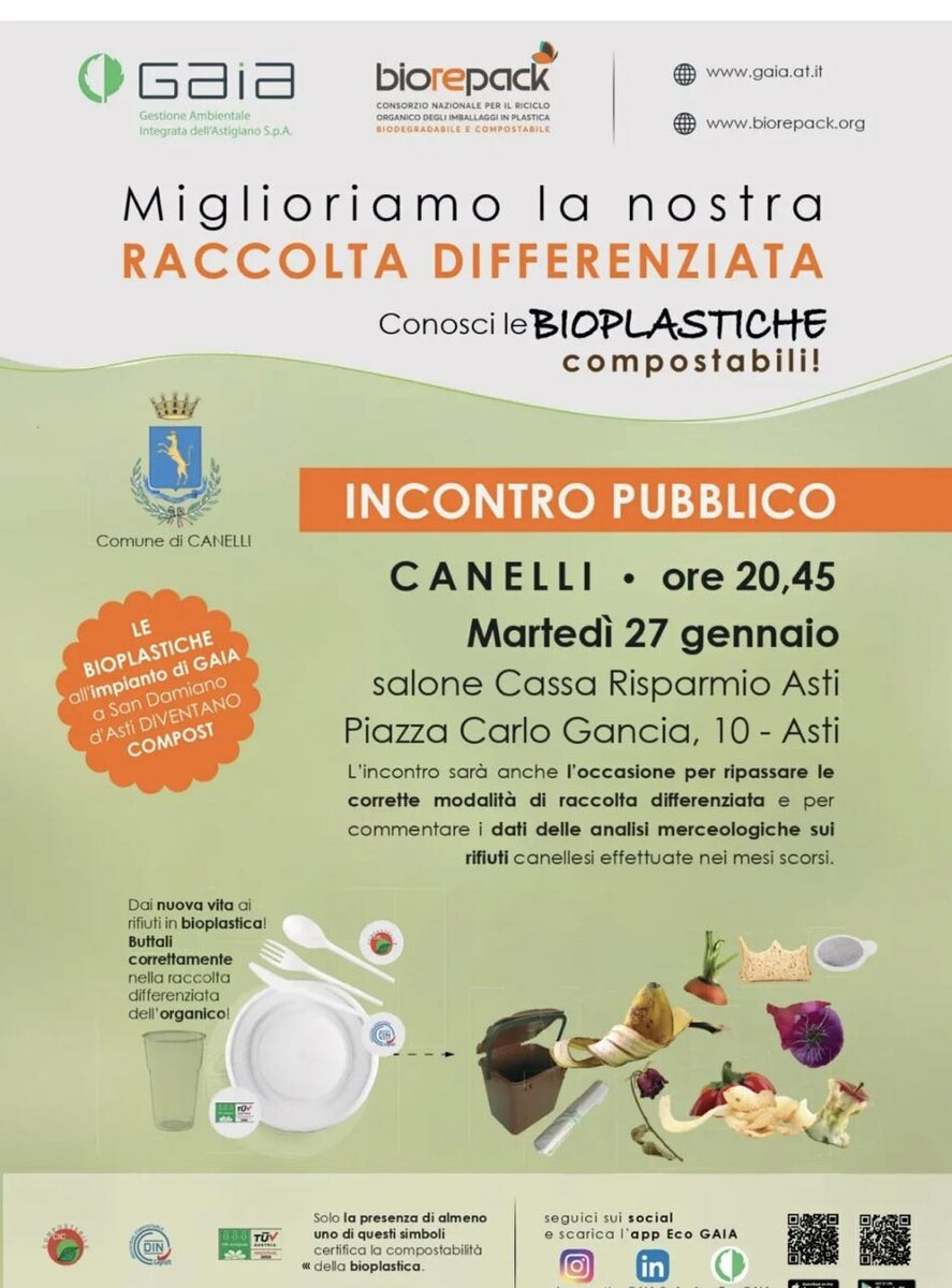 Martedì 27 gennaio, Canelli ospiterà un incontro pubblico su raccolta differenziata e bioplastiche compostabili. L’appuntamento è previsto per le 20.45 nel salone della Cassa di Risparmio di Asti e sarà occasione per spiegare ai cittadini come riconoscere e quindi conferire correttamente gli scarti compostabili incrementando la qualità e la quantità della raccolta differenziata dell’organico.