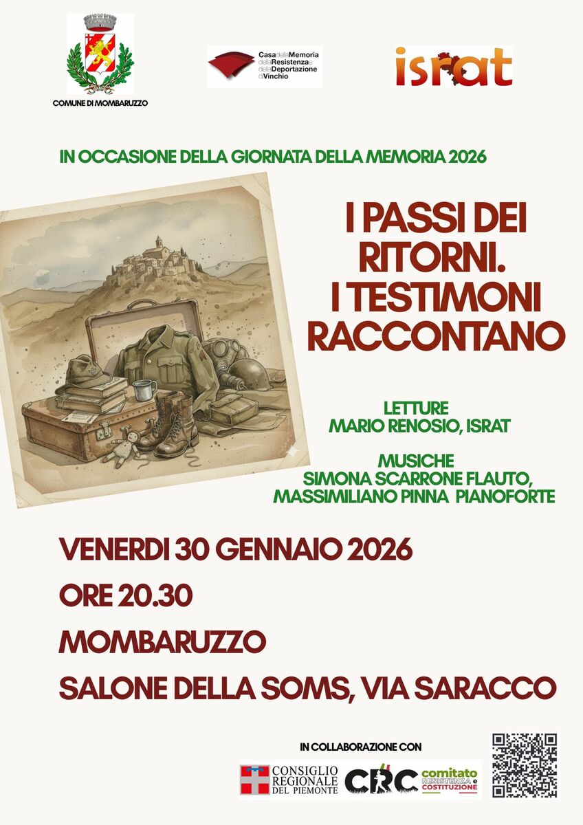 Il 30 gennaio, nella settimana della Giornata della Memoria, Mombaruzzo ospiterà l’appuntamento pubblico “I passi dei ritorni. I testimoni raccontano”, previsto per le 20.30 al Salone della SOMS, in via Saracco.
